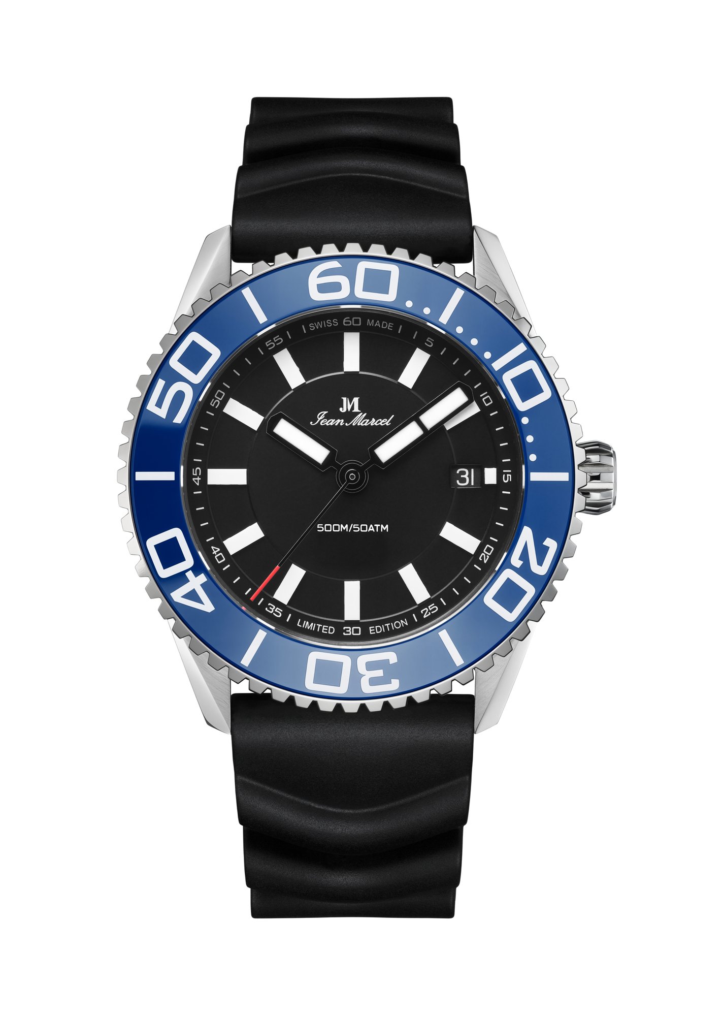 - äußerst hochwertiges Kautschukband mit Edelstahl-Dornschließe und JM-Gravur